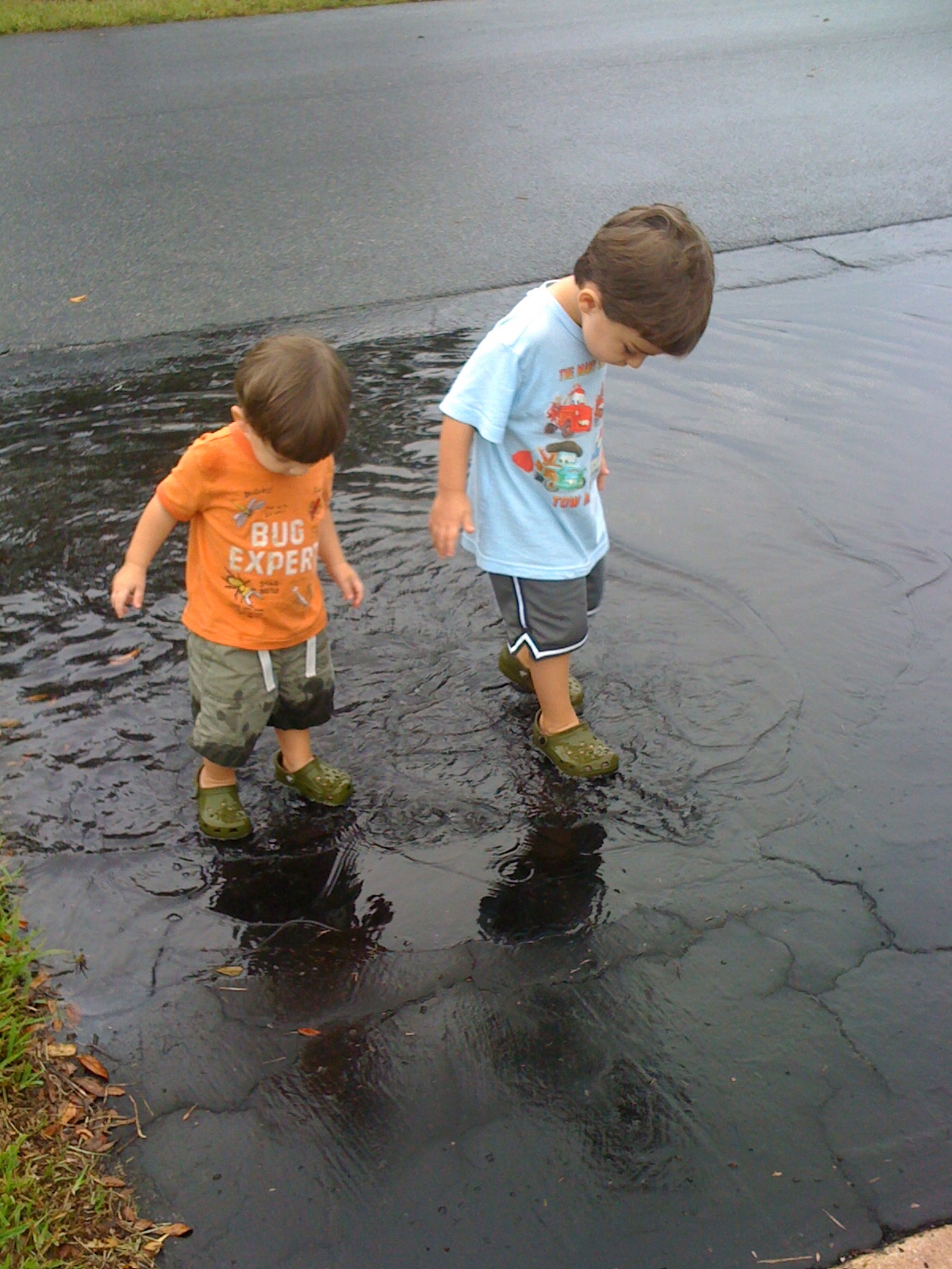 2. We’ve had a lot of rain here lately, especially in the afternoons. After Riley’s naps, I take the boys for walks around the neighborhood and let them jump in puddles. It’s such a simple pleasure, for them splashing and me watching.