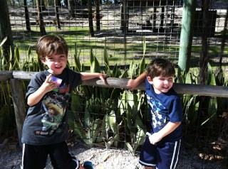 For us, the Naples Zoo is just across Alligator Alley, about an hour and a half from home. The ride out was fine except for one nasty storm, but the rainbow that came with it was exquisite and worth the hassle. I only wish I could’ve taken a picture, but I was busy driving…and opening up bags of pretzels, passing Sippy cups back and forth, and peeling bananas. You think texting and driving is dangerous? Try parenting and driving. Anyway, we made it across the Sunshine State with one pee stop, and we were inside the gates of the zoo by 10:30am.