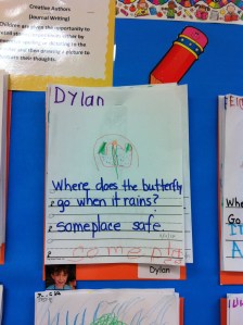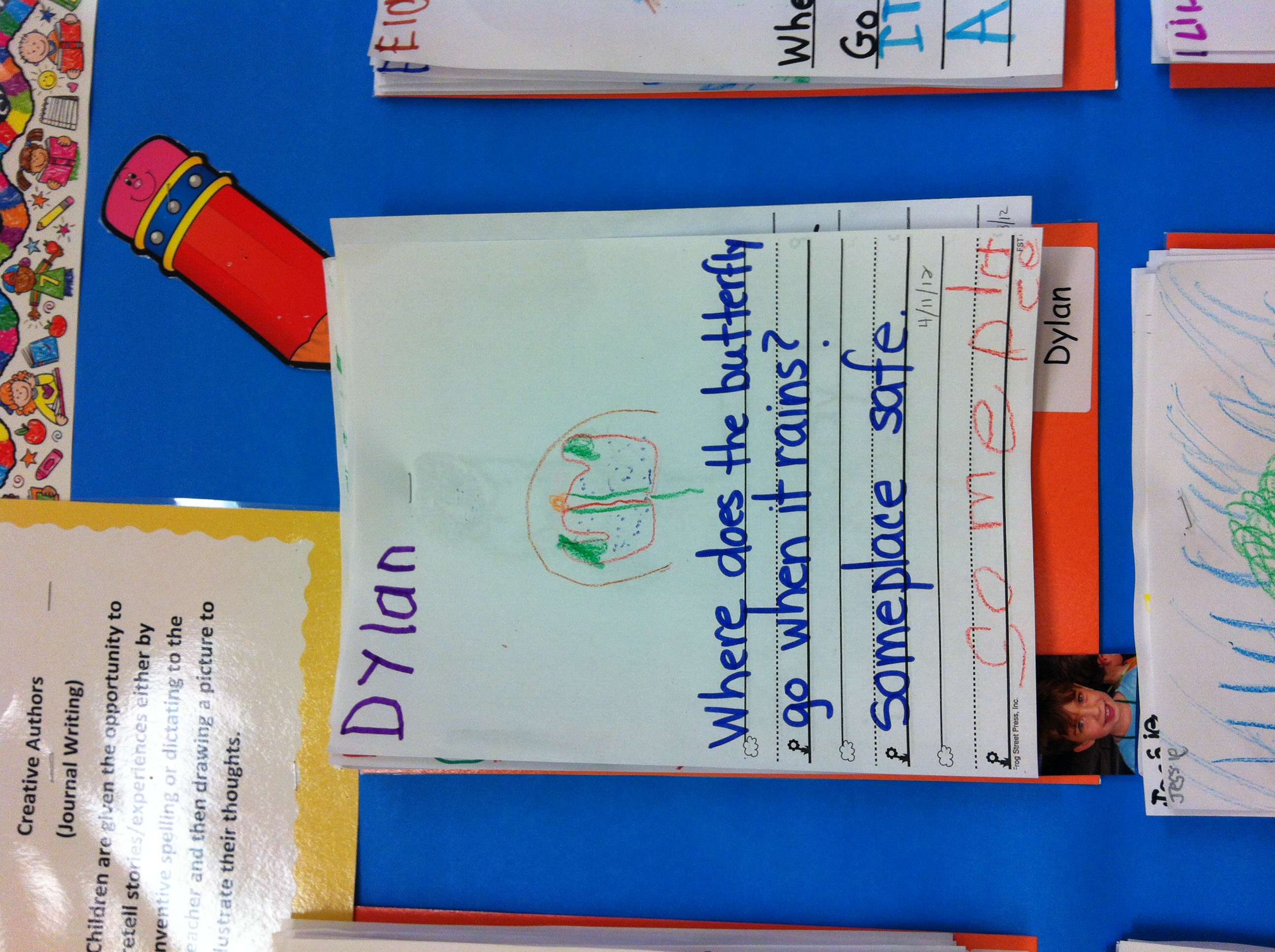 Dylan’s teacher told me a wonderful story yesterday afternoon. At school, they read aloud a book called “Where Does The Butterfly Go When It Rains?” It was a thinking book, she told me. The book didn’t actually answer the question; rather it made the students think about all of the possibilities. After they finished reading the book, the kids were asked individually (for their journals) where they thought the butterfly went when it rained. Dylan’s answer was: “Someplace safe.”