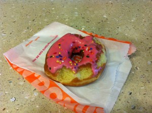 In case you can’t read the handwriting (we know who Dylan inherited his writing skills from), it says: “Dear Mommy, I love you because…I love you.” Perfection. Here’s the almost perfect donut the boys picked out for me on their early morning excursion to the card store while I slept in:
