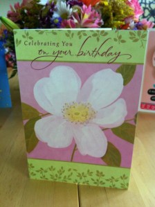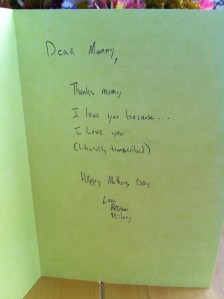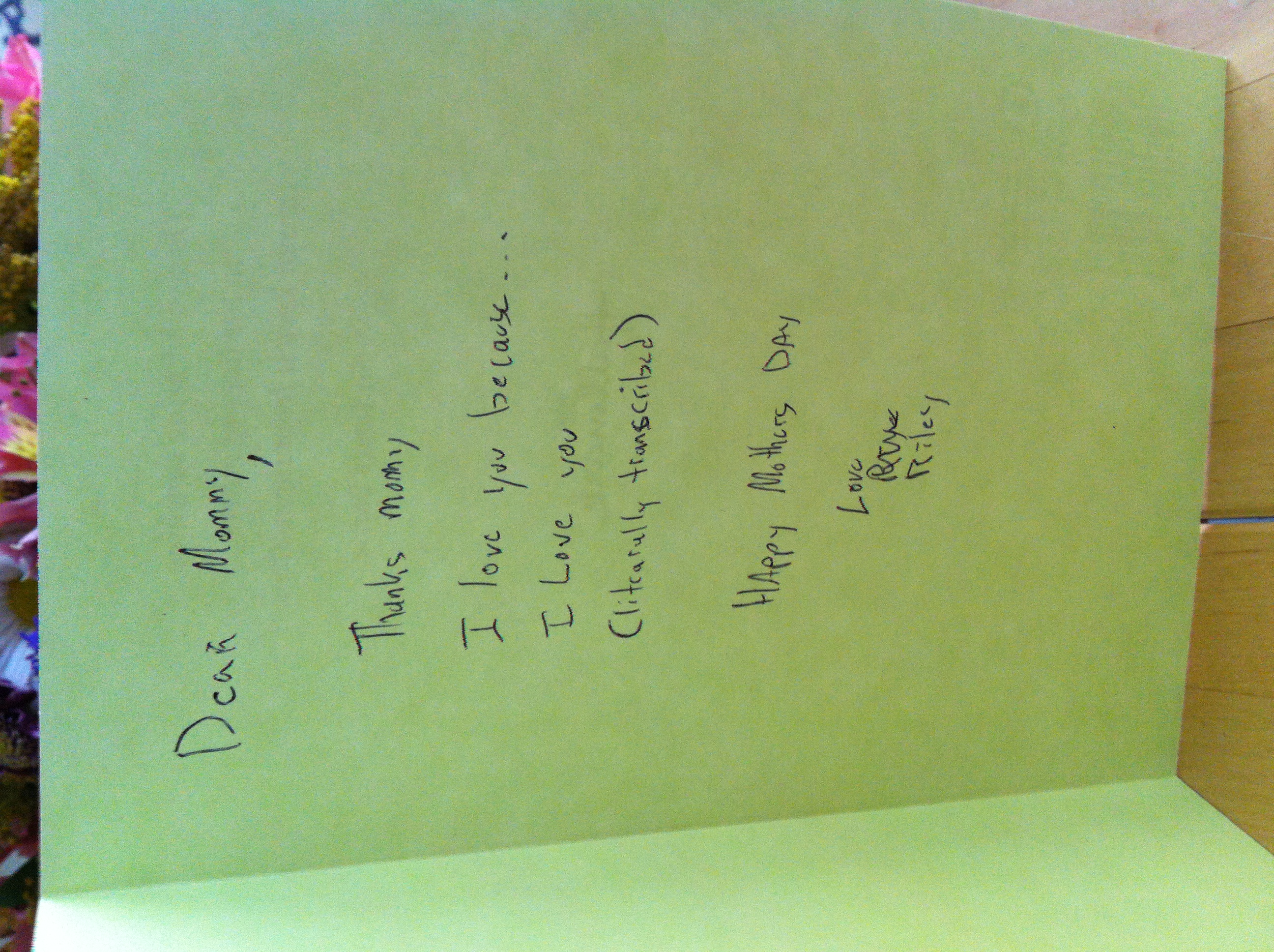 Yes, it’s birthday card, but Riley picked it because he wanted me to have the flower. This is how he signed the card (as told to Daddy):