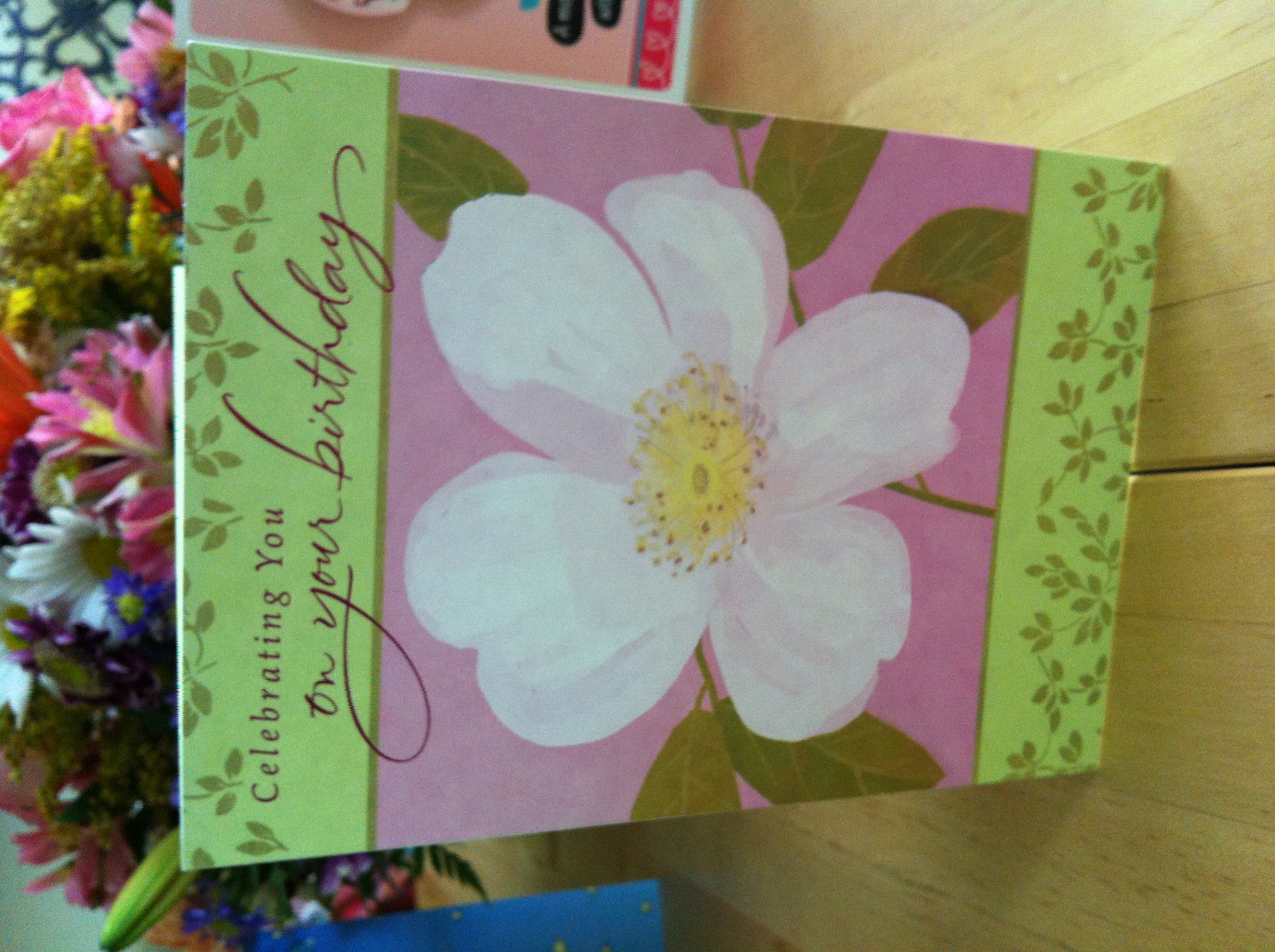 Flowers and a plethora of cards, including this perfect one from Riley: