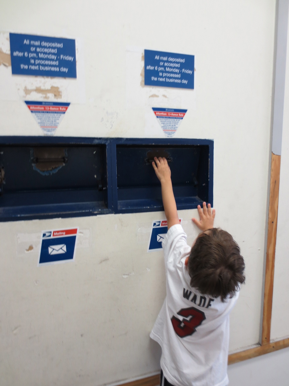 After he dropped the envelope in the slot, I said, “Congratulations Dylan! You mailed your first letter!” which prompted a few people standing nearby to snicker. (I like to think they thought it was a cute rite-of-passage rather than an exercise in silliness by an overly enthusiastic Mama.) The whole thing was a bit corny, but you should’ve seen the smile on Dylan’s face (and mine) as he mailed his very first letter.