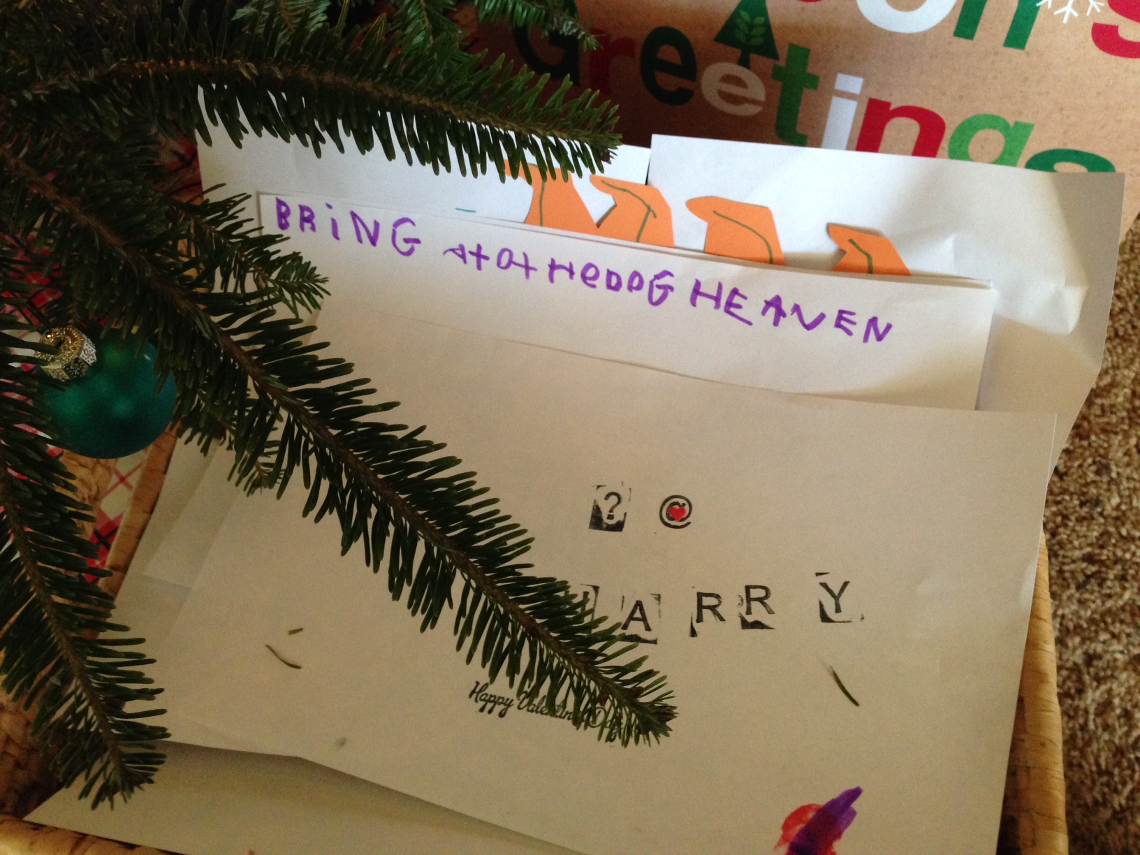 I put a basket under the Christmas tree for all the kids’ letters and pictures for Santa. I told them Santa would take them back to the North Pole on Christmas Eve (i.e. that I would put them in an XL Ziploc bag and stuff them in the back of the closet until further notice). Riley put his pictures for Harry in the basket under the tree.