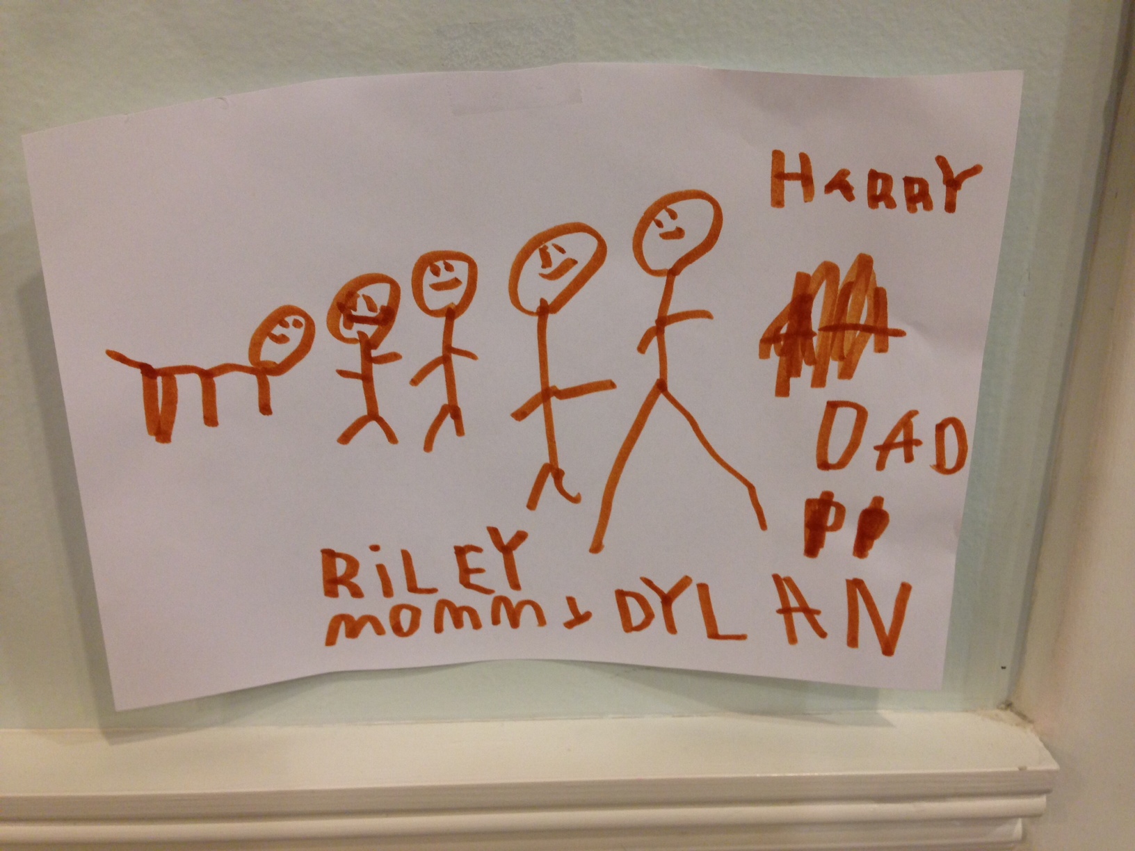 When it was Riley’s turn, he told the balloon artist he wanted a dog. A black and white dog. I knew what he was up to. He wanted her to make Harry. Riley talks about, draws about, sings about, dreams about, thinks about, and writes about Harry all the time. (On the other hand, Dylan, my emotional creature, rarely talks about Harry. This, I’m sure, will bite us in the ass at a later date.)