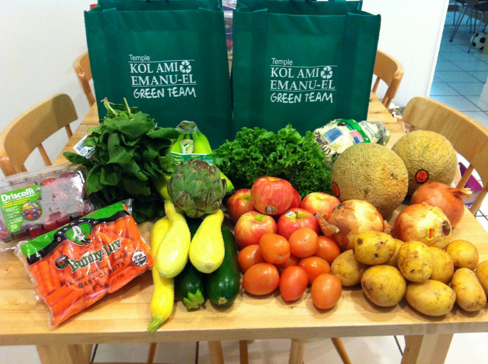 …and artichoke and cantaloupe and spinach and strawberries.  I joined an organic produce coop at the boys’ preschool and today was the first delivery.  For $45, I got two reusable grocery bags filled to the gills with the following: