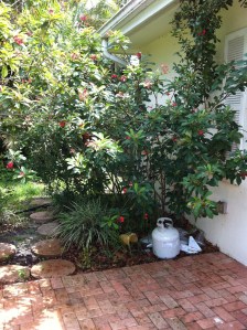 We finally got around to dealing with the overgrown landscaping jungle that was swallowing our backyard. We cleared the land, pulled up weeds and roots, put down fresh soil, and planted a Meyer lemon tree and flowers.