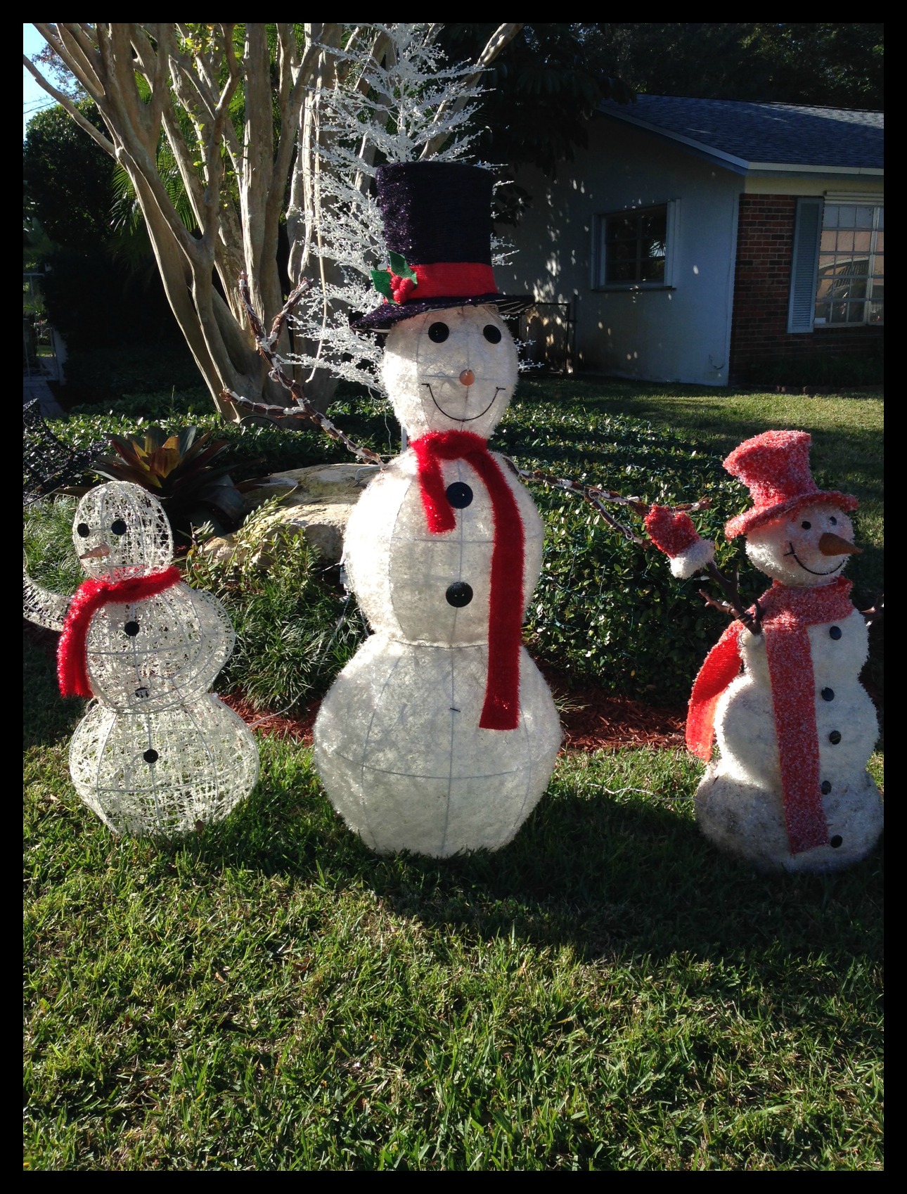 There’s this one house on the little block that has always decorated for Christmas perfectly. There’s no inflatable nativity scene blowing in the breeze on the front lawn and no blinking lights that only cover one third of the house. No, this house has green garland framing the front door, a beautiful wreath with a big, red bow centered on the roofline, three lit candles in each front window, soft yellow lights blanketing every hedge in the yard, and three sparkling snowmen on the side lawn. Every time we walked by this house that first Christmas in our house, Dylan would point his pudgy finger at the snowmen and say, “noman.”