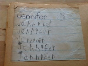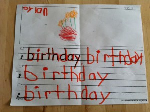 Here’s my early handwriting from Kindergarten.  For all of my worries about Dylan’s fine motor skills and, well, everything else a Mama could possibly worry about, his handwriting looks better than mine did at the same age.