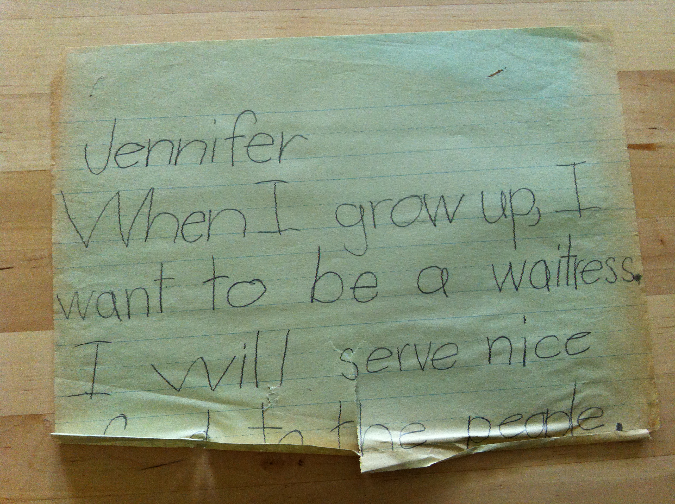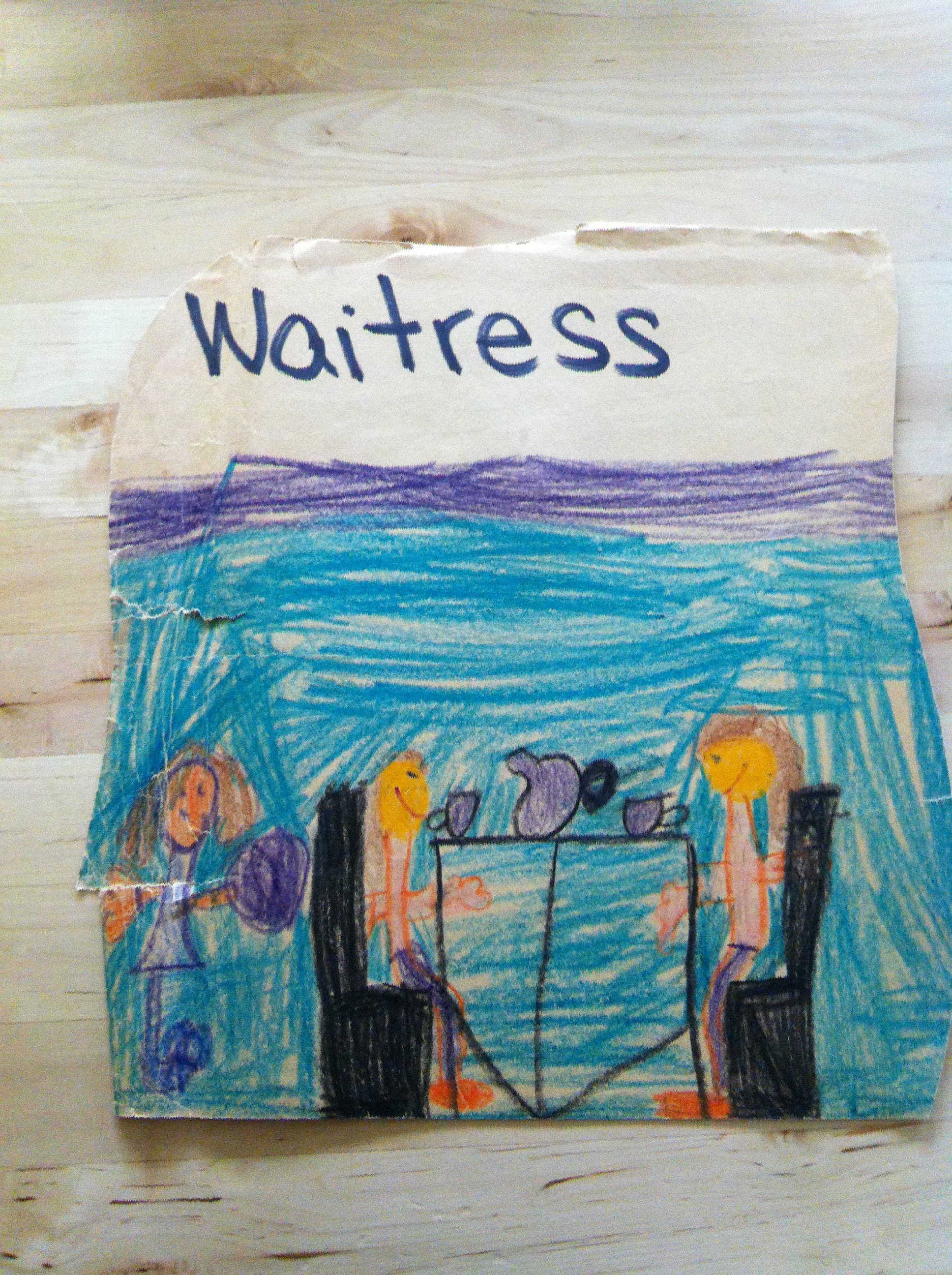 “When I grow up, I want to be a waitress.  I will serve nice food to the people.”  Priceless.  Actually, I did wait tables in high school.  And being a mom is kind of like being a waitress, except I don’t get tips.