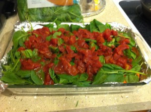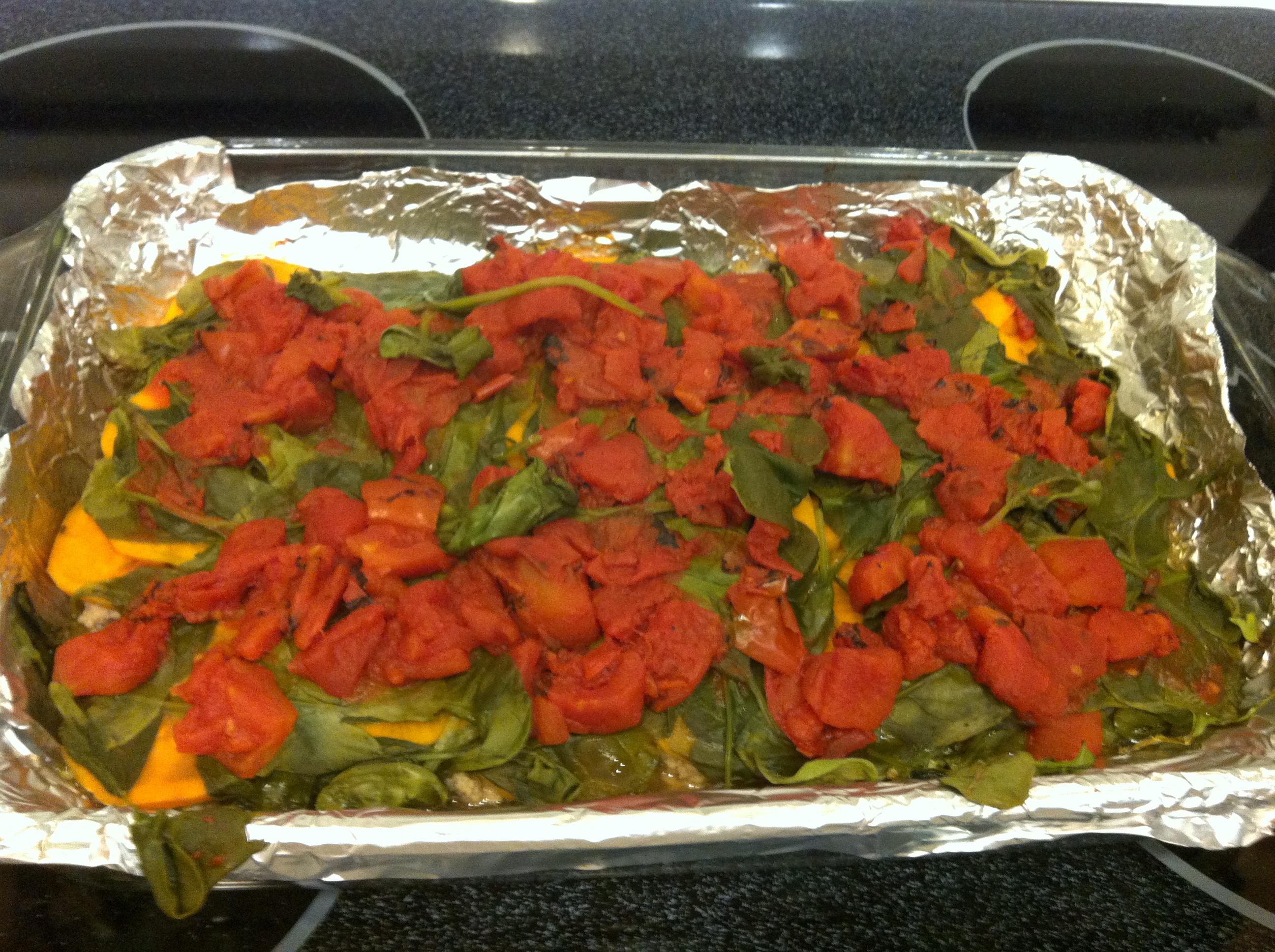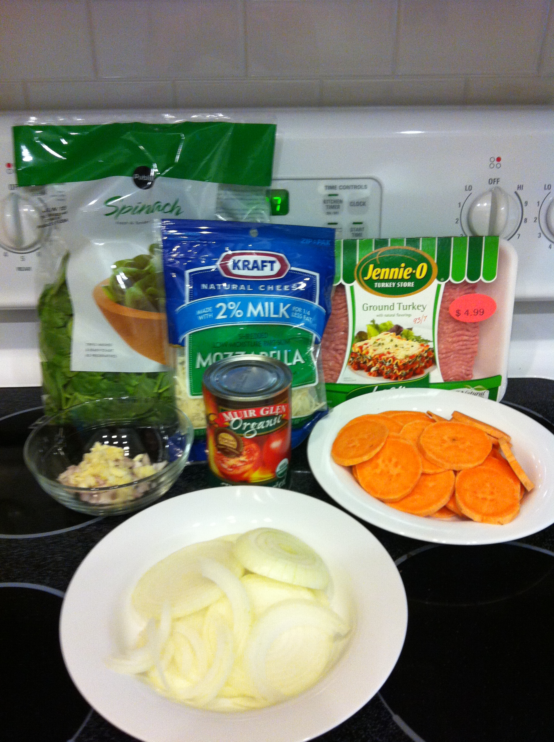 Here’s how I put it all together.  I started with the ground turkey, which I sautéed with minced garlic, shallots, salt and pepper, and bit of extra virgin olive oil.  Everything else was raw and layered on top (onions, sweet potatoes, spinach, and diced tomatoes with juice).  Voila: